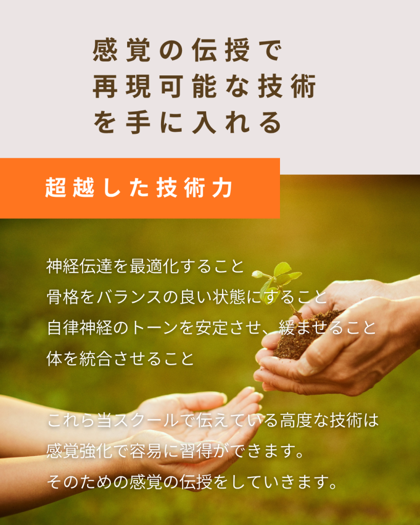 技術の習得について。組織を深部までリリースしたり、体の声を聴きながら骨格を矯正していく技法は、単なる作業ではありません。これらの技術を磨いていく上で「感覚」の向上が必要です。感覚を向上させるためには、力を抜く事、感覚的な修練、そして上達者からの伝授が近道となります。これらを通して確実に技術を身に付けていきます。