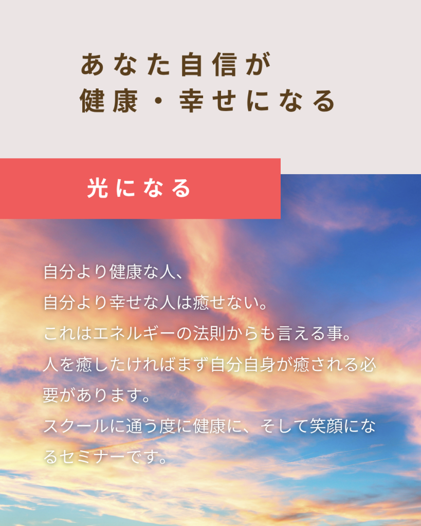 当スクールの最大の目標は、日本一「幸せなセラピスト」を輩出するスクールになる事!!実は・・・不幸せなセラピストってこの業界多いのですが、それでは真の意味でクライアントを健康にはできません。セラピストが満たされれば満たされるほどに、クライアント様は健康になる。いわば、セラピストが光の存在となり、多くの人達にその光が波及していってほしいと願っています。そのために、講師はセミナーを通して受講生を引き上げていきます。