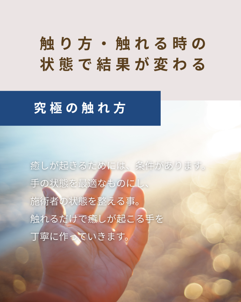 まず、触診技術を重視します。触れるという1つの行為は、それだけで相手の状態や、原因を感知する大事なツール。また、触れ方1つで治癒することもあるからです。逆に触れ方1つで悪化させることもあります。最初のタッチで信頼が築かれるほどなのです。この触診技術をしっかりと習得していただくためにセラピストのための手を作っていきます。
